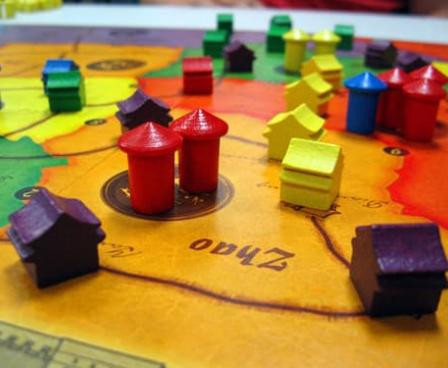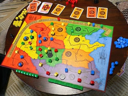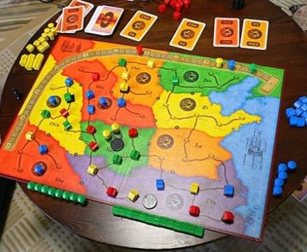 China is an abstracted game of political influence in China. Players use cards to place pieces (Houses or Emissaries) into the nine regions on the board. When all house spaces in a region are filled (or at the end of the game), players score for majorities of houses in that region. At game end, players then score for having majorities of emissaries in two adjacent regions. Players also score for having four or more houses in an uninterrupted sequence along one of the roads on the board.
