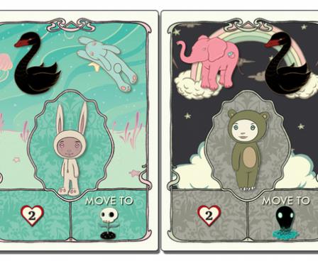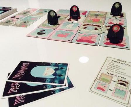 Dreamwell is a 2-4 player competitive game featuring the art of Tara McPherson where players are trying to locate their lost friends in the Dreamwell. The Dreamwell is represented by a 4 x 4 grid of tiles. Each tile shows a environment and a creature, in addition to pathways to neighboring tiles. At the beginning of the game, players will be dealt two cards, each of which shows a picture of the friend whom he or she is trying to locate along with the two creatures and environment that will be required to find that particular friend.