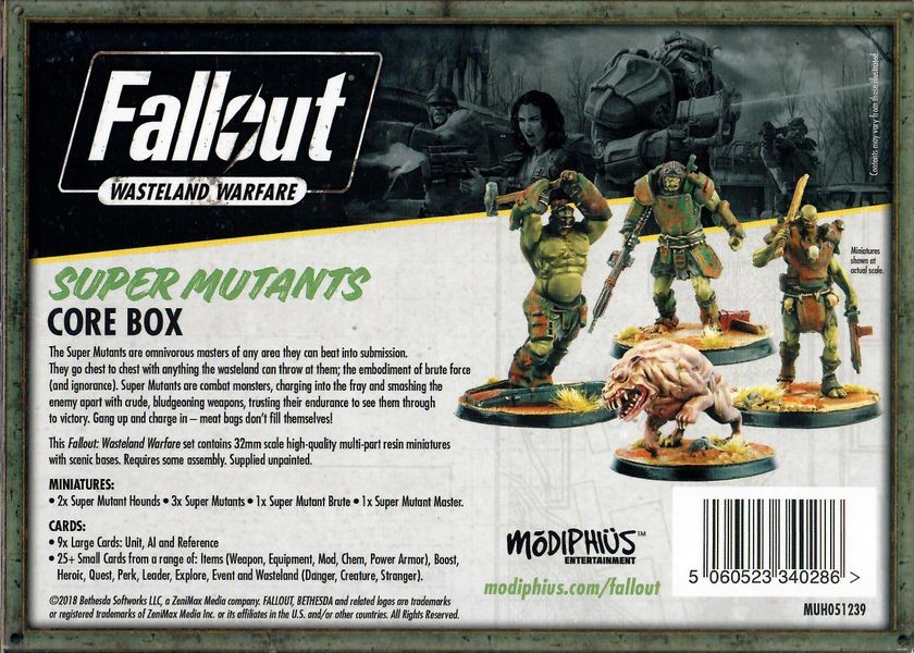 Expand your collection with with these high quality multi-part 32mm scale resin miniatures of 2 Super Mutant Hounds, 3 Super Mutants, 1 Super Mutant Brute, 1 Super Mutant Master and all the cards you need to play as the Super Mutants faction