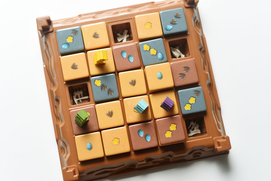 Fossilis features a unique 3D dig site board, with recessed pockets filled with dinosaur bones, and thick, chunky terrain tiles that cover the dig site. Players have to use strategy, timing, and a little bit of luck if they want to make the best discoveries, get their name in all the paleontology journals, and of course, win the game.