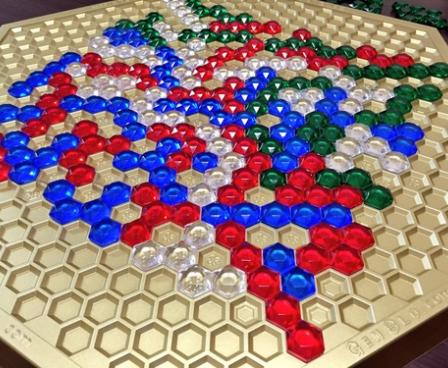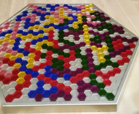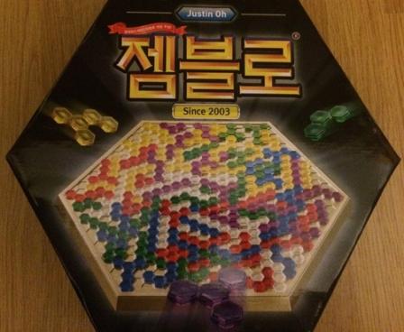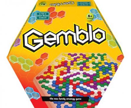 Gemblo is an abstract strategy game with translucent, colored pieces, each of which is made up of one to five hexagons. Each player has an identical set of pieces in a unique color. The goal is to get rid of all of your pieces by placing them on the hexagonal game board. Each piece that you place after the first cannot touch previously-placed pieces of the same color; instead each piece must be a distance of "1" from another piece of the same color, where 1 is the length of a side of one of the small hexagons. Another restriction is that the distance being measured can't directly cross another player's piece, but it can lie at the junction of two pieces. Once all players have placed as many pieces as they can, they count the number of hexagonal units in the pieces they couldn't place, and the player with the lowest score wins.