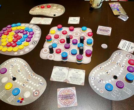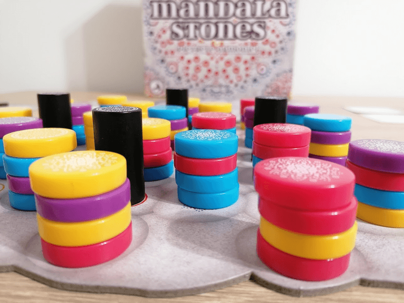 To score, choose to remove either (1) a color that appears on the top stones of at least two towers on your player board or (2) any number of top stones on your player board. In the latter case, you score 1 point for each removed stone. In the former case, you score points for each removed stone depending on the scoring condition for that space on your player board, which might be based on the height of that stone in a tower or the number of colors in that tower or the height of all towers on your board. Place all removed stones on the shared central mandala, building from the inside out and possibly scoring points depending on the spaces that you cover.
