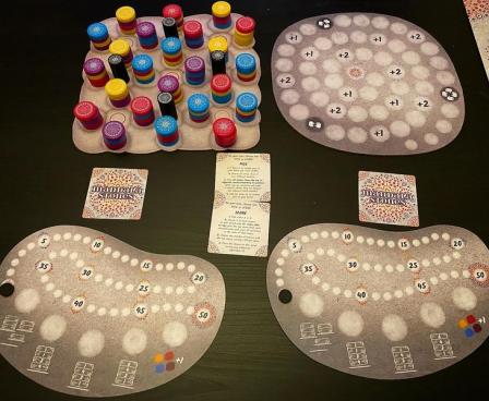 If a player can neither pick nor score OR if a stone placed on the central mandala covers the game-ending space based on the number of players in the game, complete the round so that everyone has the same number of turns. Each player can then score one of two secret objective cards in their hand, then the player with the most points wins.