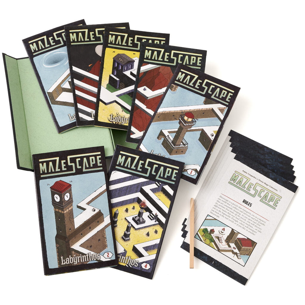 Mazescape is a fascinating and intriguing game of labyrinths for one player that guarantees intense brain racking moments as you search for the exit. It is a game you can take anywhere and play time and time again to discover all the different nooks and crannies of the seven maps included.