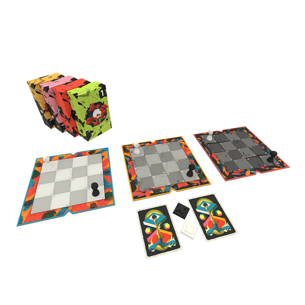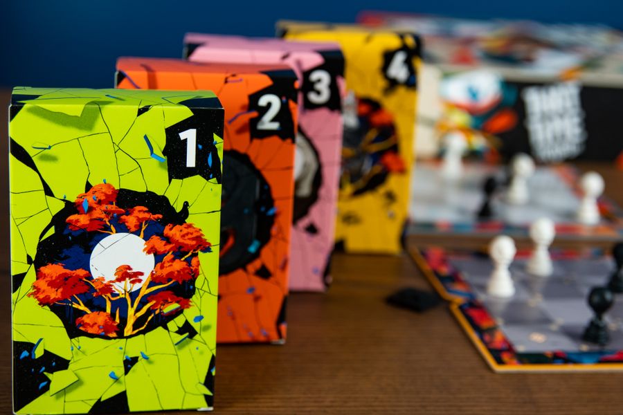 On a turn, choose a single copy of yourself on the board where your focus token is located, then take two actions with this copy, with actions being movement to an adjacent orthogonal space, time travel forward to the next board (travel from the past to the future is not allowed), or time travel back to the previous board, leaving a copy of yourself in the current location when you do. Sure, you traveled to the past, but if you stick around long enough, you'll be right back where you started, so now you're there, too! At the end of your turn, move your focus token to a different board.