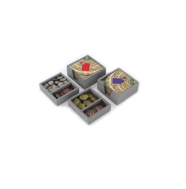 Insert compatible with 7 Wonders 1st Edition®, and has space for the Babel®, Wonder Pack®, Cities®, and Leaders® 1st edition expansions. The design provides both efficient storage and improved game play. The trays can be utilised during the game, and they greatly aid set-up and clear-away times. The rules and boards act as a lid on top of the trays.This product consists of a flat-pack of 4 Evacore sheets. The trays require assembly, which is quick and fun, using ordinary PVA glue. Detailed instructions are included in the package.