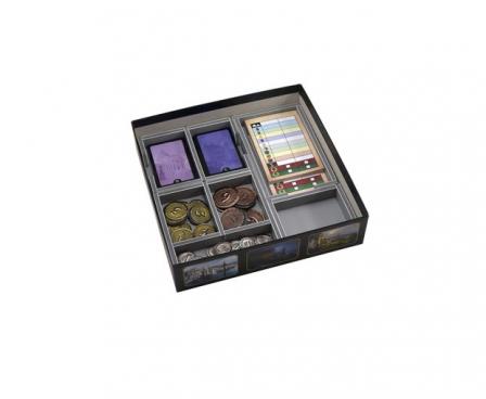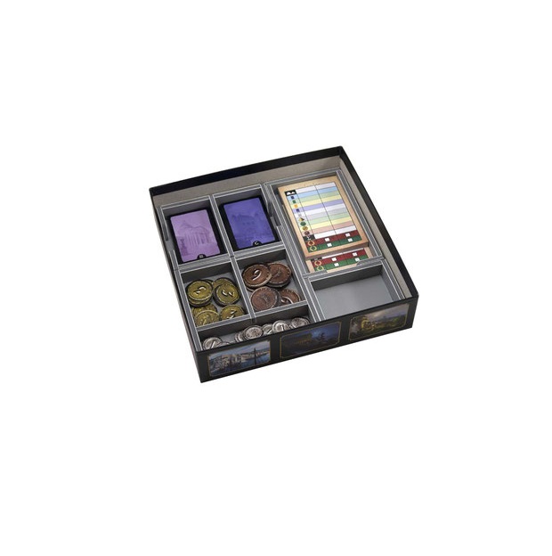 Insert compatible with 7 Wonders Duel® and the Pantheon® expansion. The design provides both efficient storage and improved game play. The trays can be utilised during the game, and they greatly aid set-up and clear-away times. The rules and boards act as a lid on top of the trays.