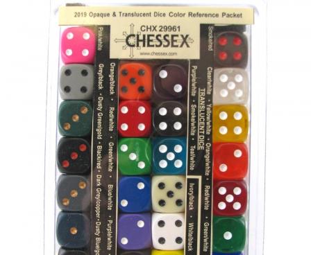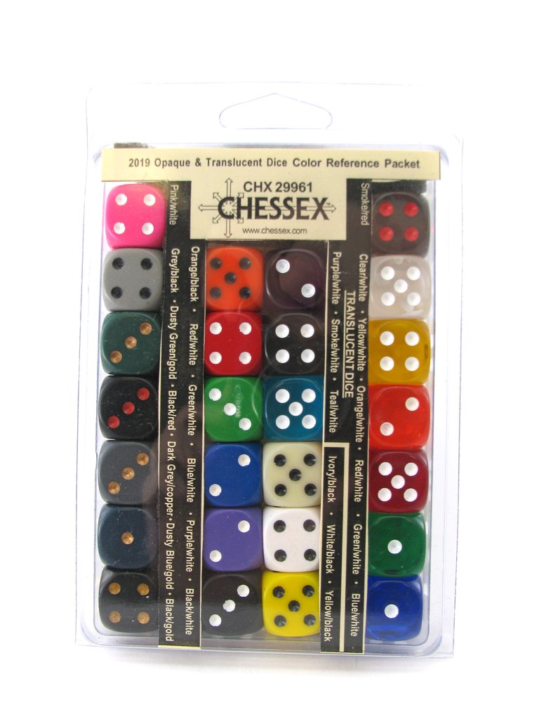Interested in adding unique colored dice to your collection, then this pack is for you! This Opaque and Translucent Dice Color Reference Packet by Chessex is perfect for anyone looking to see what color dice are available by Chessex (the year referenced on the package may differ, but the dice are the same). This pack includes 10 different translucent dice and 16 different opaque dice, totaling 26 unique dice!