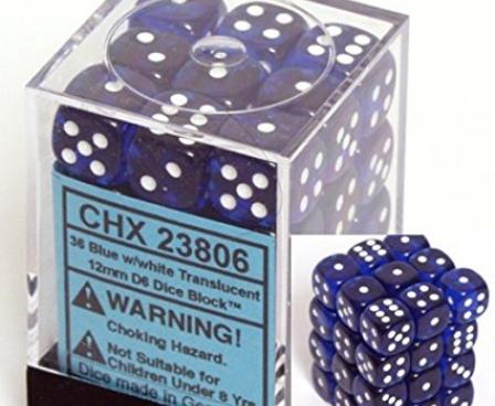 Blue with White Translucent - 12mm Six Sided Die (36) Block of Dice