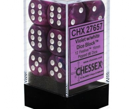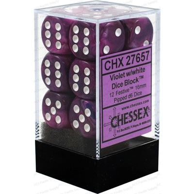 Twelve plastic Violet colours, Festive 16mm 6-sided Dice. Festive dice are a opaque dice with unique swirls of multiple colours embedded throughout. These dice are Violet in colour and have White pips.
