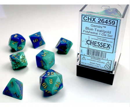 This is a 7 Set Dice Gemini Blue-Teal/Gold made by the good people over at Chessex.