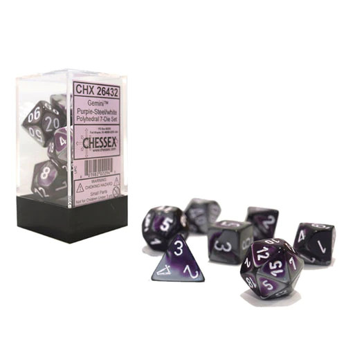 Chessex dice are made of a particularly dense material for a better feel when rolling, allowing for flatter faces and sharper edges. This CHX 26432 Gemini Purple-Steel w/White set contains one D20, one D12, two D10s (00-90 and 0-9), one D8, one D6, and one D4. Size: 16mm - 20mm (5/8 inch - 13/16 inch).