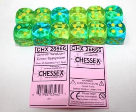 Chessex Gemini Translucent 16mm d6 12 Dice Green-Teal/Yellow 26666