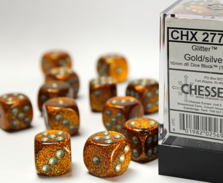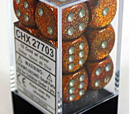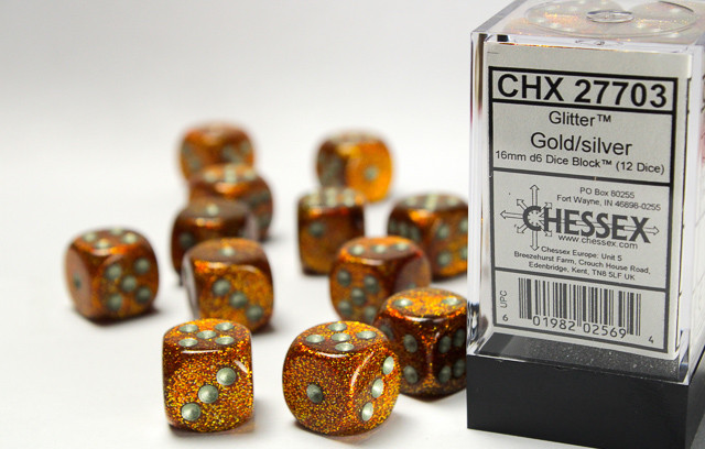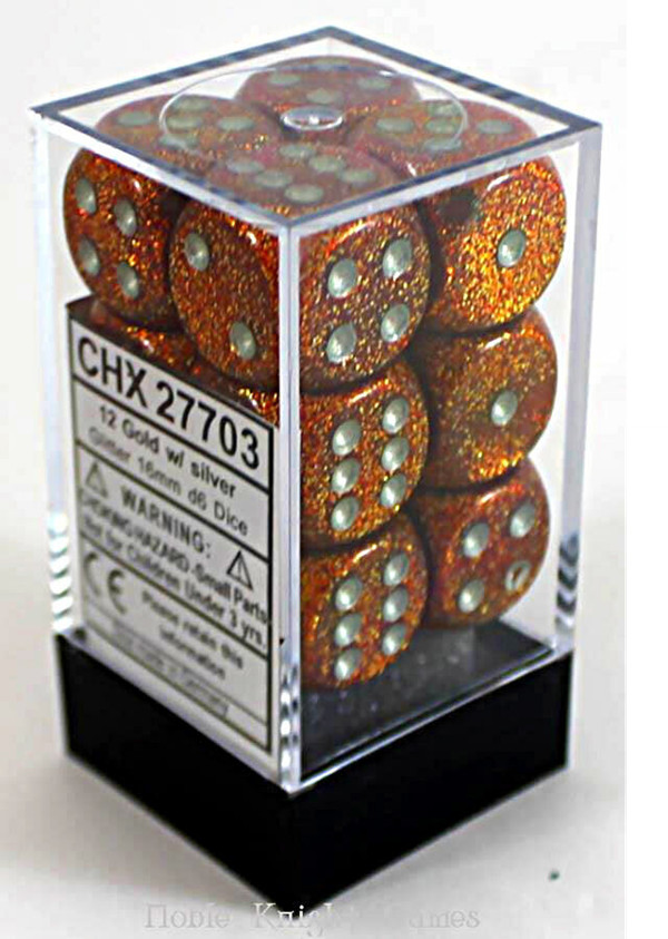 SHARED TO : 0 in stock 161000 Weight: 100 gAgesMax: 100 Ages : 10+ Players : 1- Game Length : CONTENT DESCRIPTION Each set contains 12 Glitter Gold 16mm d6 dice with silver pips Log in or register to post comments Comments