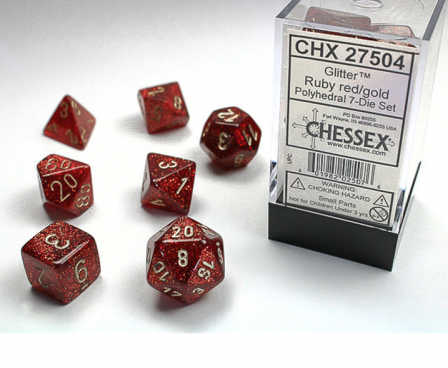 SHARED TO : 0 in stock 161000 Weight: 200 gAgesMax: 100 Ages : 12+ Players : - Game Length : CONTENT DESCRIPTION 7-die Poly Set (d4,d6,d8,d10,d12,d20 and dPercentile)Pack contains seven dice. Red with glitter and gold numbers. Log in or register to post comments Comments