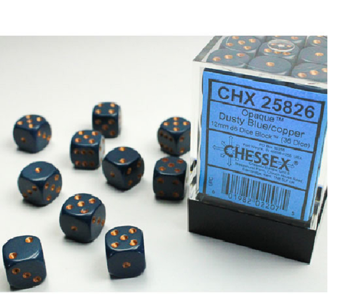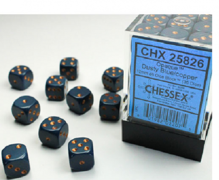 SHARED TO : 0 in stock 97000 Weight: 200 gAgesMax: 100 Ages : 12+ Players : - Game Length : CONTENT DESCRIPTION Opaque 12mm d6 36 Dice Block Dusty Blue/Cooper Contains 36 6-sided (d6) dice Log in or register to post comments Comments