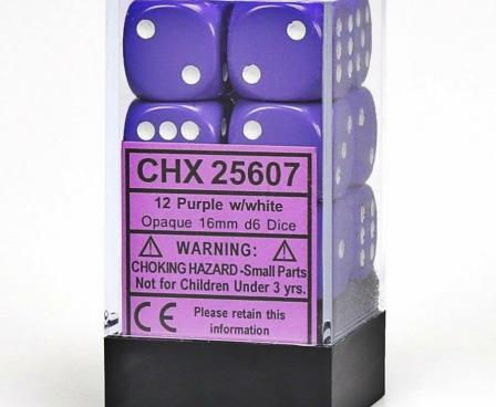SHARED TO : 0 in stock 65000 Weight: 150 gAgesMax: 100 Ages : Players : - Game Length : CONTENT DESCRIPTION Twelve plastic 16mm Blue Opaque 6-sided dice.Chessex Opaque dice have a striking rich colour.These dice are Purple and have White pips. Log in or register to post comments Comments