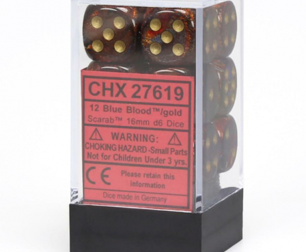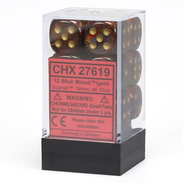 The dice are blue blood with gold numbers. They are packaged in a clear hard plastic container.