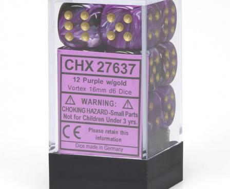SHARED TO : 0 in stock 161000 Weight: 200 gAgesMax: 100 Ages : 12+ Players : - Game Length : CONTENT DESCRIPTION Polyhedral Dice Set from the Chessex Vortex™ line.The dice are purple with gold numbers. They are packaged in a clear hard plastic container.The set includes:12x 16mm D6 Log in or register to post comments Comments