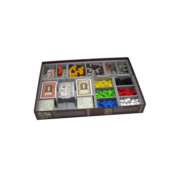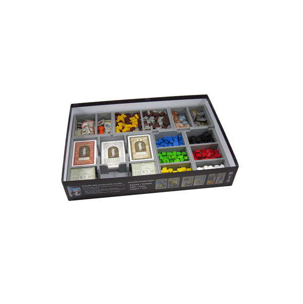 The board and rules act as a lid on top of the insert trays. Once fully loaded the box can be stored vertically and the lid closes flush. First place the player boards on top of the player piece trays. Next goes the board. Note that in the base game box there is room for only one board, the other boards form your collection should be stored in one of the expansion boxes. On top of the board go the Venus and forum boards, followed by the rules.