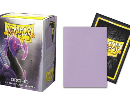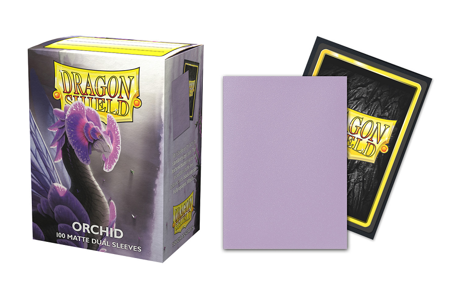 Dragon Shield Dual Matte sleeves. Clear front and a textured matte back. Fully opaque sleeves with a black interior, an elegant backdrop for black bordered cards.