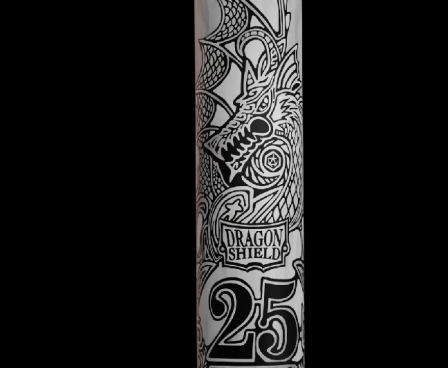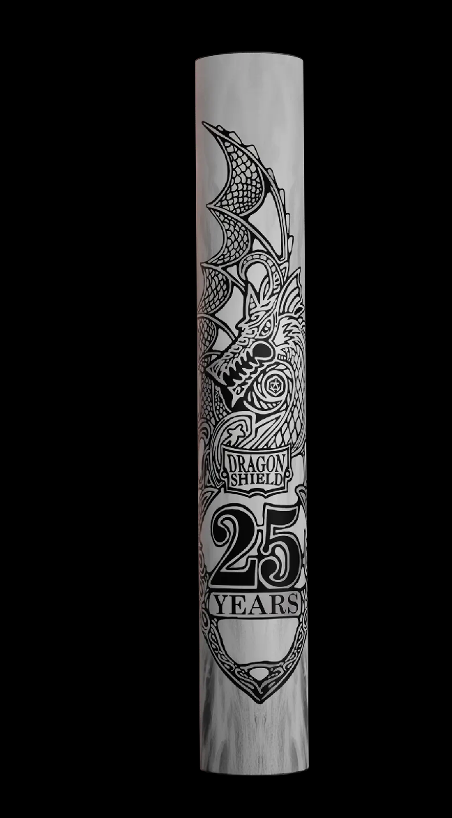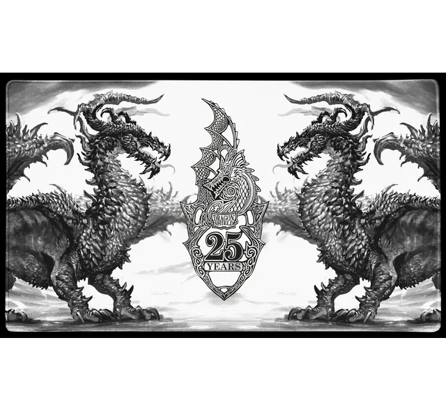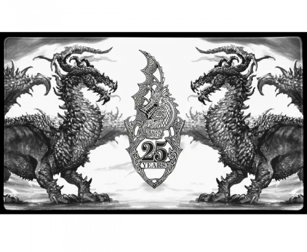 Pop off the lid and slide out the special edition anniversary playmat with dragon artwork by Godfrey Escota. Unroll it with a single flick, and watch as its great expanse reveals two formidable dragons guarding our commemorative 25th anniversary shield. Daunting in black and white, this playmat will see you through countless battles and stay fast under your every move.