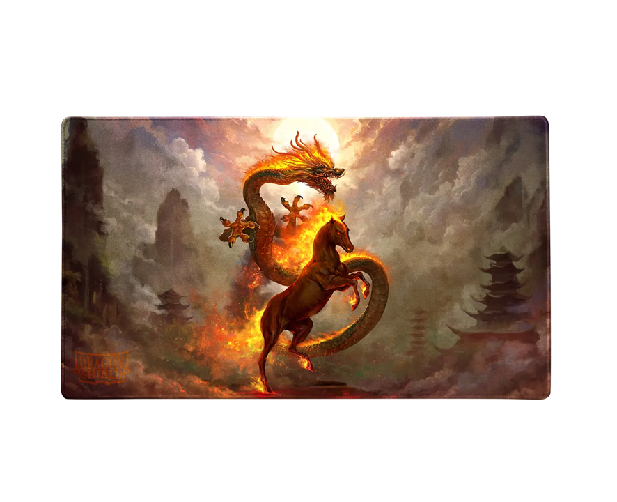 Enjoy the silky smooth surface texture of this high-quality playmat. Together with the non-slip, rubber bottom and premium stitched-edge, this Dragon Shield playmat will remain stable, even with the untamed power of the Fire Horse.