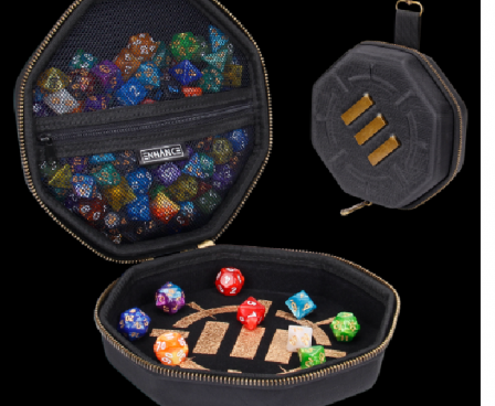 "ENHANCE Tabletop Dice Case - Equipped with heavy duty zippers, scratch-resistant lining, and a large soft-lined dice rolling tray with large wall. The ENHANCE Dice Storage Case is the perfect addition to your collection of RPG travel accessories. It is actually two products in one, with one half safely storing up to 150 dice and the other functioning as a large dice tray that can be passed around the gaming table. A hard shell reinforced case protects your dice from wear and tear, while the soft lined interior keeps all your dice free from blemishes and unsightly scratches. It also features a metal attachment clip for attaching to backpacks and bags. Our Dice Travel Case is great for Dungeons and Dragons, board games, and various other tabletop RPG games. Replace your small dnd dice bags and bulky dice trays with the ENHANCE Dice Case, a solution for all RPG players.