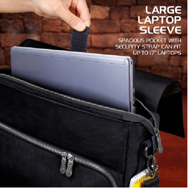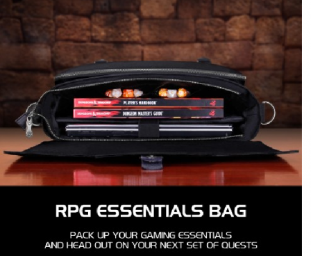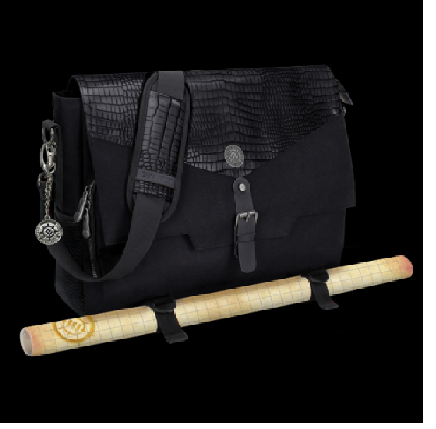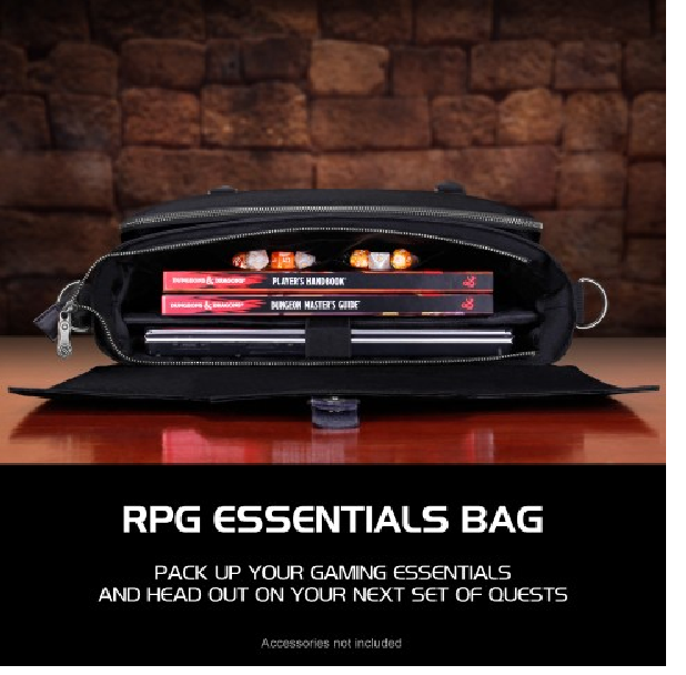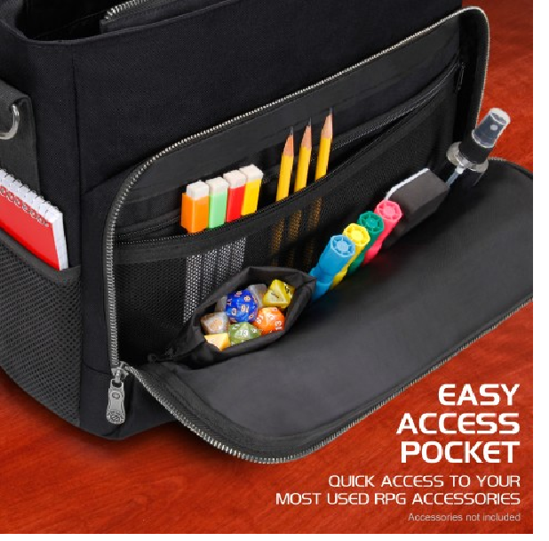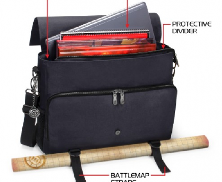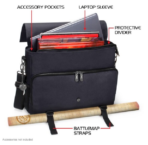 Equipped with Battlemap Travel Straps, Padded Laptop Sleeve, Heavy Duty Metal Clips, and Zippers. The messenger bag style design offers incredible versatility and comfort. The interior features a thick padded divider to help organize your character's gear and includes enough space for up to 4 rulebooks, or a combination of binders, journals, folios, and more. There is a special compartment with an elastic security strap designed to hold up to 17"" laptops and tablets in place during travel. A very spacious front zippered pocket with another netted mesh zippered pocket inside is great for storing and organizing game materials such as dice, journals, tokens, pens, pencils, and much more.The RPG Essential's Bag features two front facing battlemap storage straps perfect for traveling with a rolled up battle grid or map. The adjustable straps can be sized to hold maps up to 3 inches in diameter. Show up to your next session with your gear in order, and take on that next quest with the ENHANCE RPG Player Essential's Travel Bag.