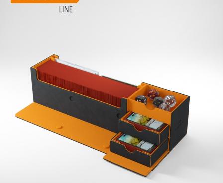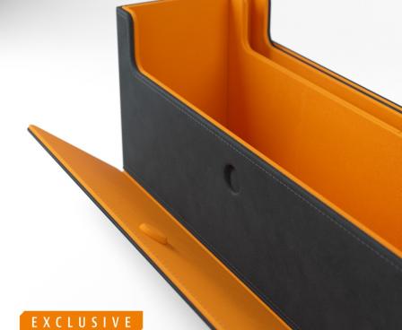 This multi-functional premium box is designed to perfectly fit 400 double-sleeved, or 540 board game-sleeved cards*. Two removable drawers with ingenious magnetic flaps provide easy access to tokens, sleeved cards, or full decks. The top compartment can be used to store played cards, accessories, or as a mini dice tray.