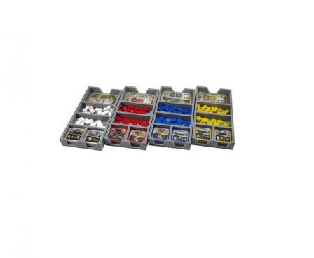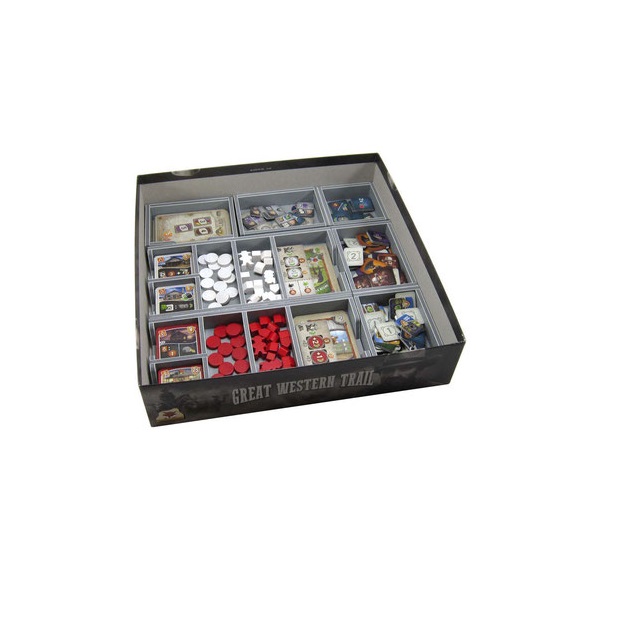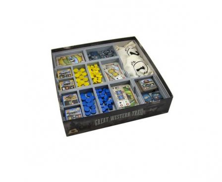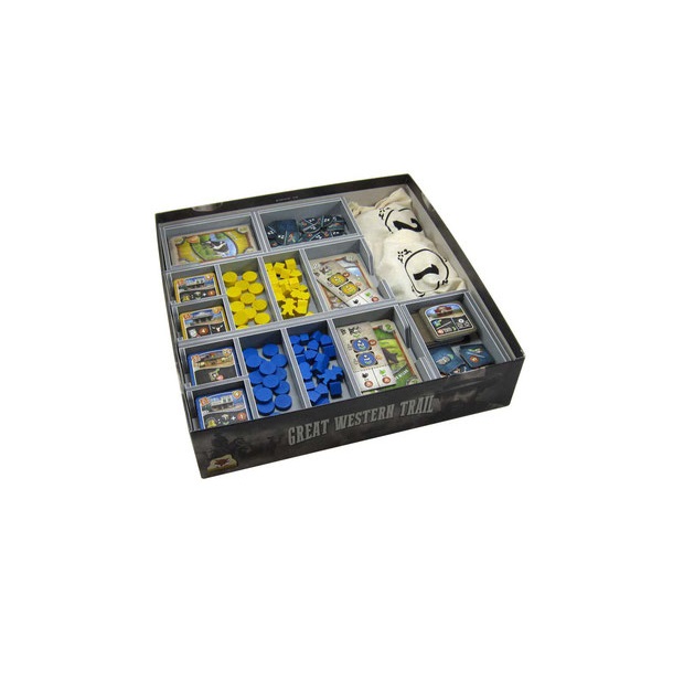 Insert compatible with Great Western Trail®, and includes space for the Rails to the North® Expansion. The design provides both efficient storage and improved game play. Many of the trays can be utilised during the game, and they greatly aid set-up and clear-away times. The rules act as a lid on top of the trays. There is space for all cards to be sleeved.