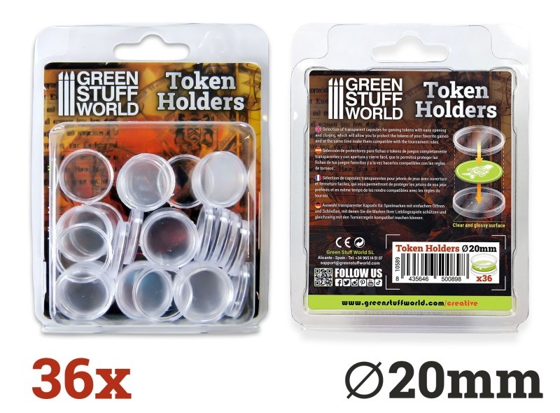 Selection of transparent capsules made of sturdy methacrylate plastic for command tokens with easy opening and closing, which will allow you to procet the tokens of your favorite boardgames and wargames and at the same time make them compatible with the tournament rules.