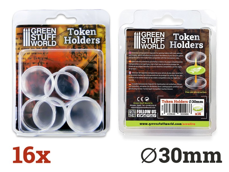 Selection of transparent capsules made of sturdy methacrylate plastic for command tokens with easy opening and closing, which will allow you to procet the tokens of your favorite boardgames and wargames and at the same time make them compatible with the tournament rules.