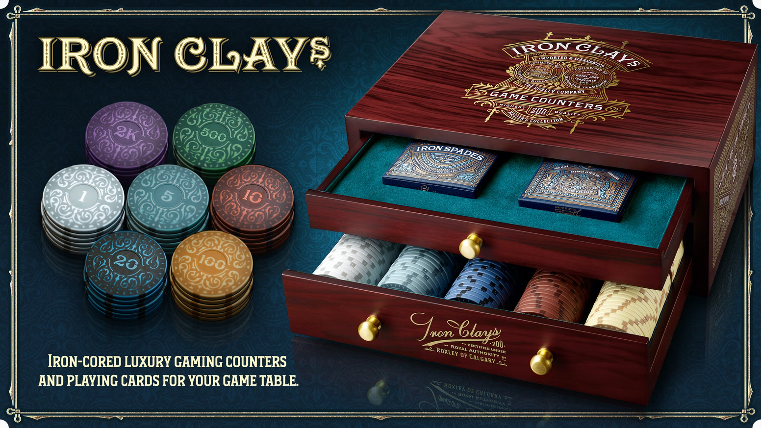 Luxury tabletop game counters with elegant storage container & beautifully designed playing cards in letter pressed box.