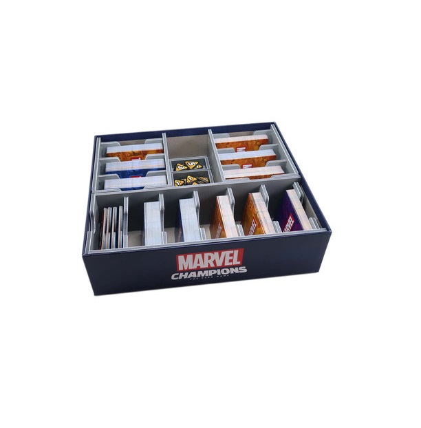 Insert compatible with Marvel Champions: The Card Game®, with space for over 900 sleeved or 1,400 unsleeved cards. The design provides both efficient storage and improved game play. The rules act as a lid on top of the trays.