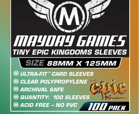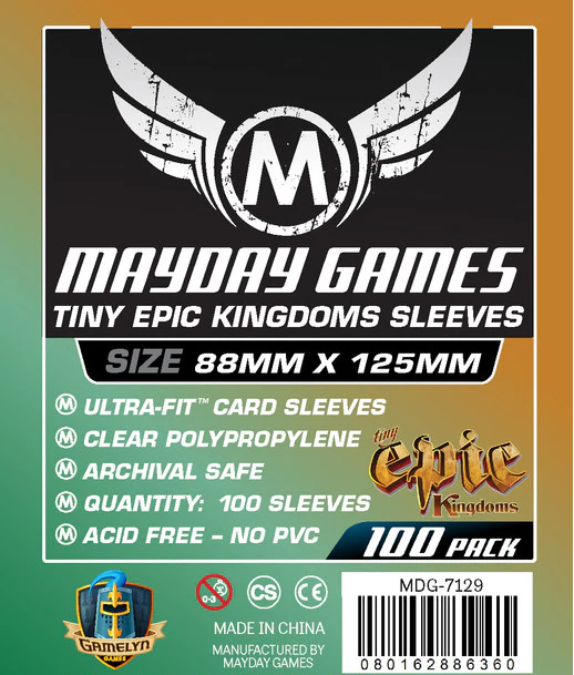 SHARED TO : 10 in stock 60000 Enter Quantity 12345678910 Add to WishlistWeight: 100 gAgesMax: 100 Ages : 11+ Players : - Game Length : CONTENT DESCRIPTION Tiny Epic Kingdoms" Card SleevesAbout these card sleeves:Custom crafted for cards sized: 88x125mm100% Archival SafeAcid-FreePVC-FreeClear Polypropylene Log in or register to post comments Comments