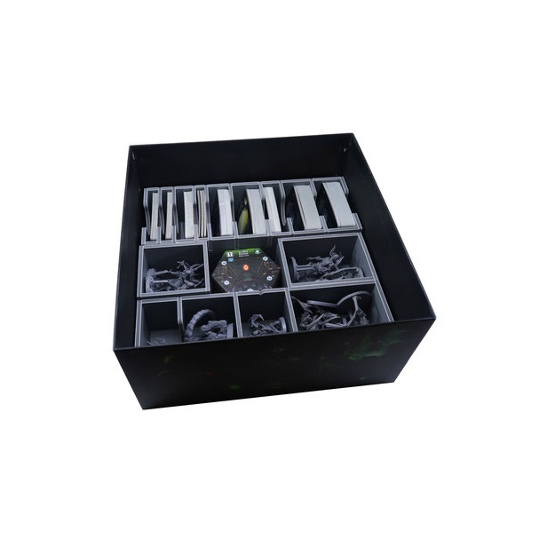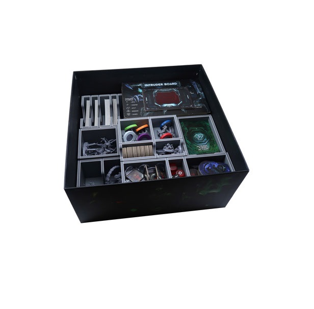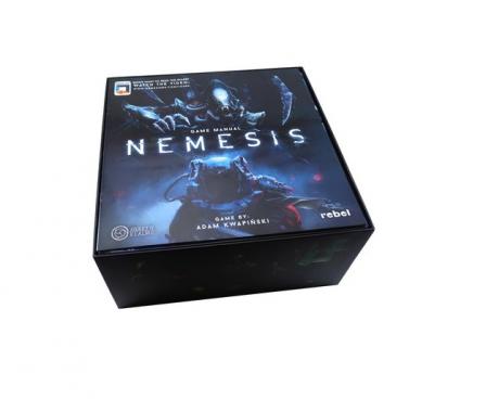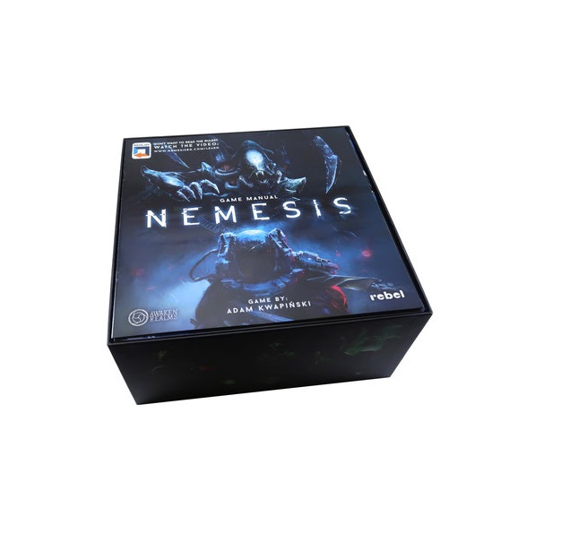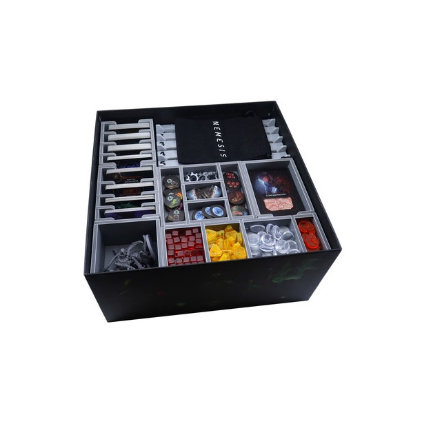 Insert compatible with Nemesis®. The design provides both efficient storage and improved game play. The trays can be utilised during the game, and they greatly aid set-up and clear-away times. The rules and boards act as a lid on top of the trays.