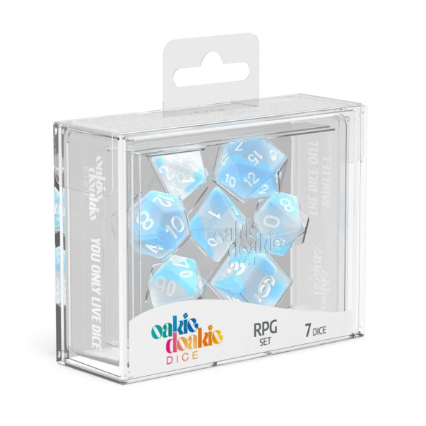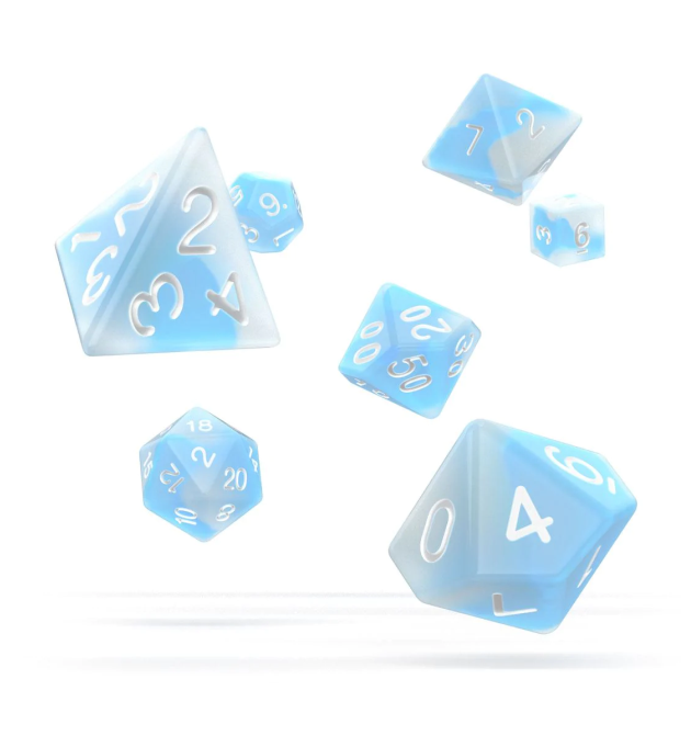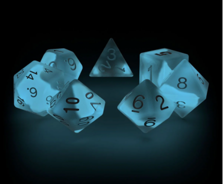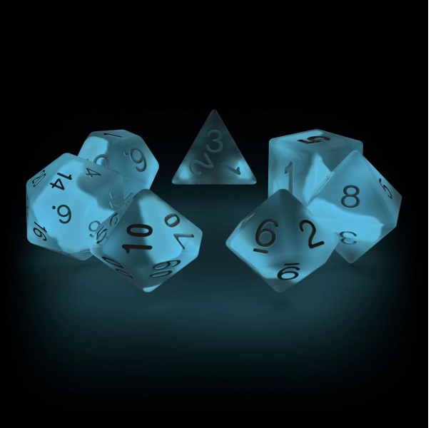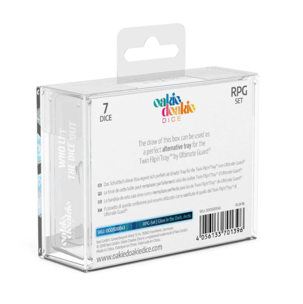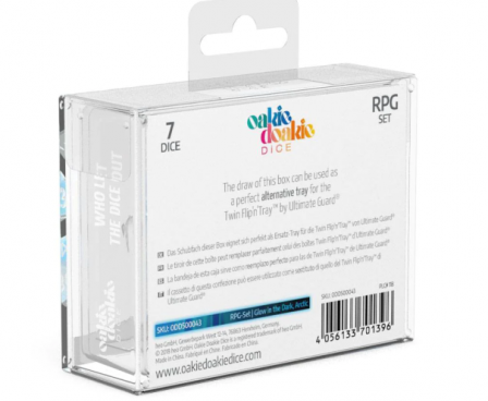 The Role-playing Game Sets consist of 7 different dice: D6, D4, 2x D10 (steps of 1 and steps of 10), D8, D20 and D12. They come packed in strong boxes with extendable shelves so you can easily take them with you and play wherever you want to.