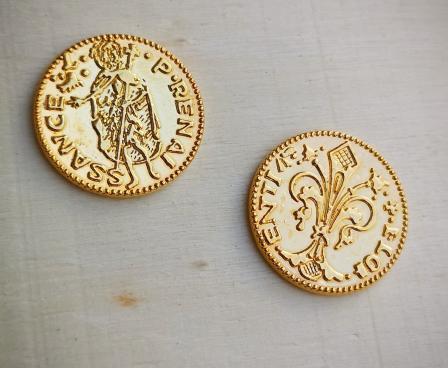 This set contains 34 metal coins (Florentine florins replies) and 4 plastic red gems to replace the plastic coins for the game Pax Renaissance 2nd edition.