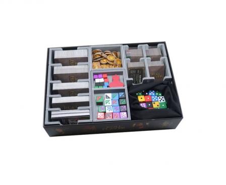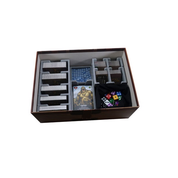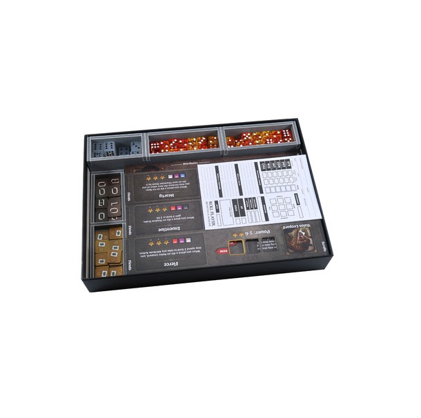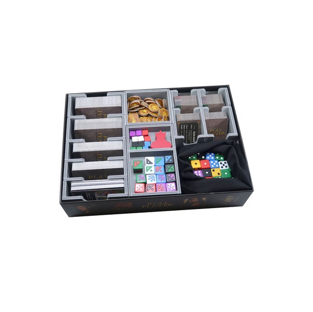 Insert compatible with Roll Player®, and Monsters & Minions® and Fiends & Familiars® expansions. The design provides both efficient storage and improved game play. Many of the trays can be utilised during the game, and they greatly aid set-up and clear-away times. The standard game dice are stored in the dice bag as shown.