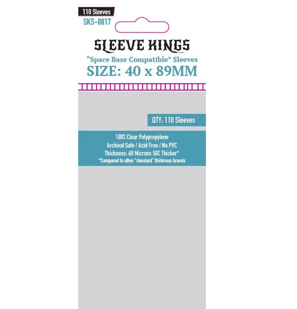 These sleeves are perfect for the game Space Base and any other cards that are 40 X 89 MM in size. Note that we sized these for 40 X 89 cards rather than 39 X 89 so we could also accommodate Coin & Crown, another popular game that is just 1 MM wider than Space Base cards, but both of these games' cards will be well protected in these sleeves!