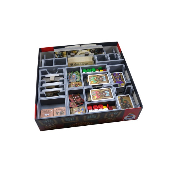 Insert compatible with The Taverns of Tiefenthal®, and the Open Doors® (Zimmer Frei!®) expansion. The design provides both efficient storage and improved game play. Many of the trays can be utilised during the game, and they greatly aid set-up and clear-away times. The rules and boards act as a lid on top of the trays.