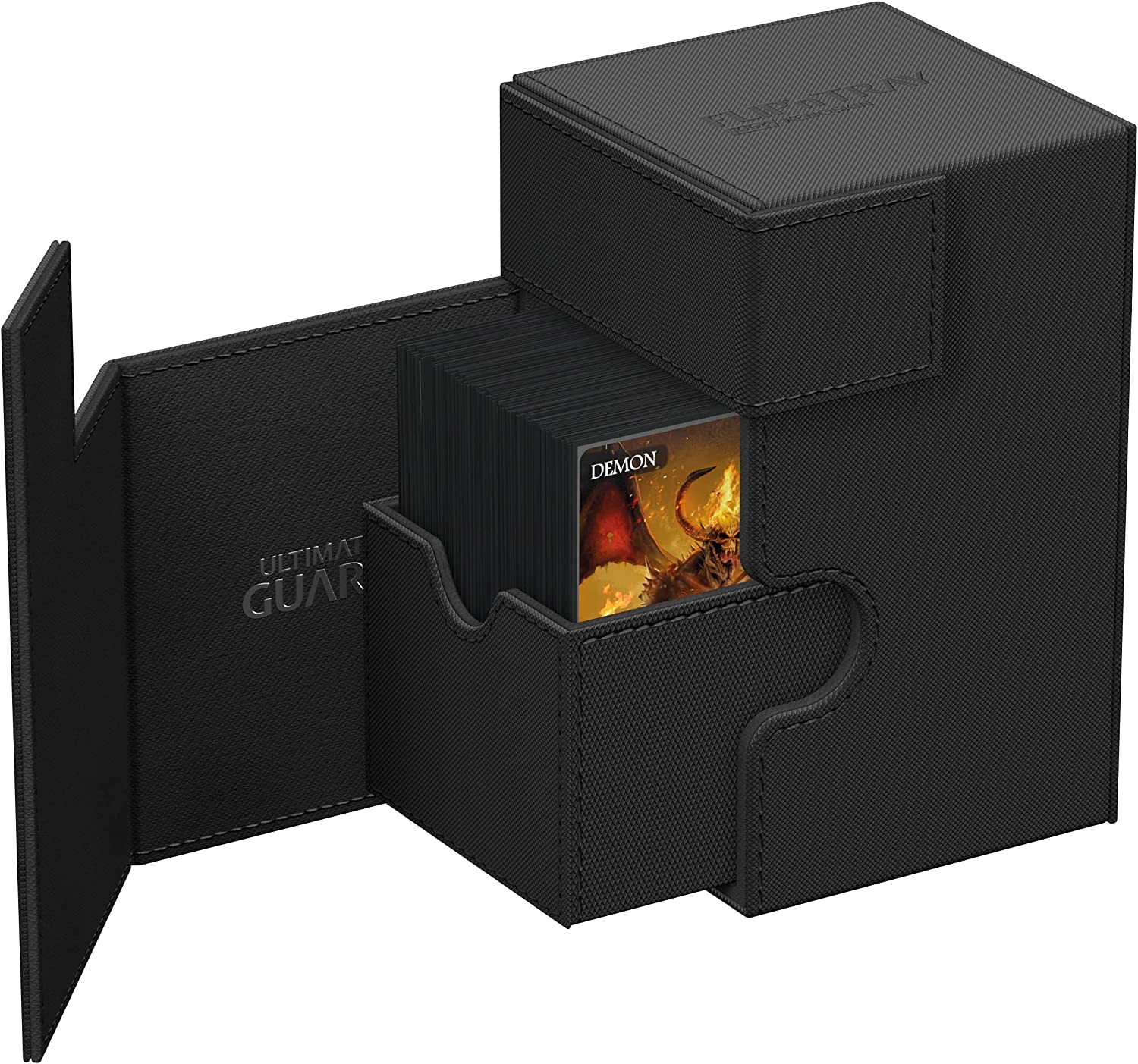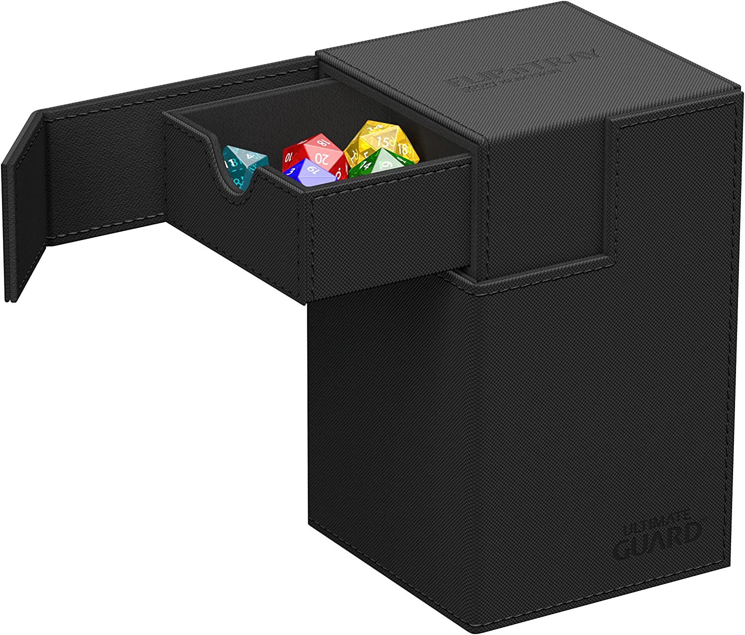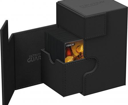 Premium XenoSkin card box with magnetic closure and card and dice trays for the protection and archival safe storage of 100 double-sleeved cards in standard size