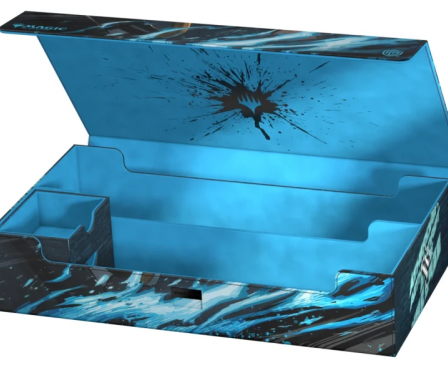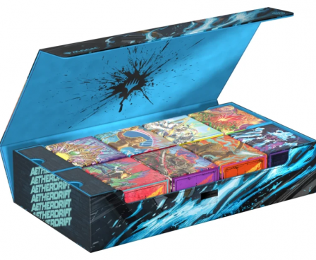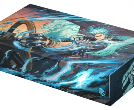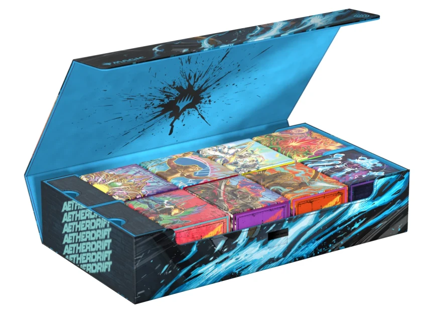 Get in on the high-speed action of Magic: The Gathering's set Aetherdrift with Ultimate Guard's Omnihive 1000+ Xenoskin. The Omnihive, with officially licensed MTG artwork, is a mass storage box designed to hold multiple deck boxes, dice and/or Play-Mats at once—or alternatively a large collection of single cards (up to 1000 double-sleeved). The two practical and flexibly positionable magnetic trays inside are, like the outside of the box, made of full-color printed and resistant Xenoskin material and have a quality microfiber inner lining. The lid of the Omnihive 1000+ Xenoskin is secured with strong magnets and an additional ZnapClaw mechanism.