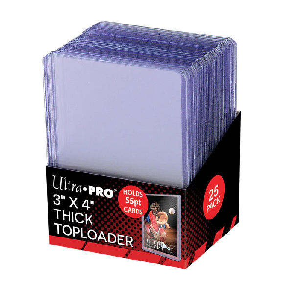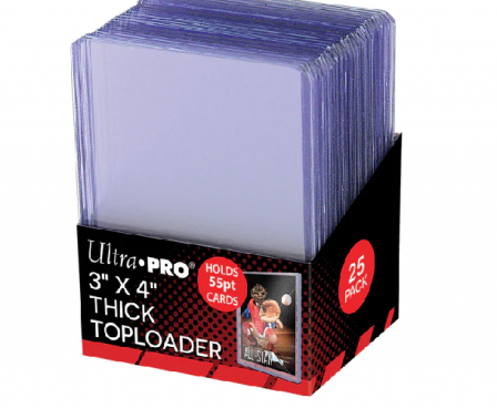 Protect your valuable trading cards with Ultra PRO's super clear, 3" x 4" "Action Packed" Toploaders for standard-sized cards up to 55pt thickness. These rigid PVC plastic holders enclose the cardS and keep them clean while preventing damage. Each pack comes with 25 individual pieces.