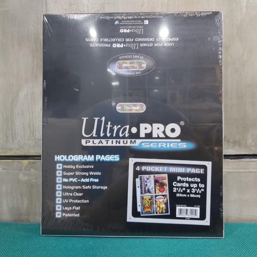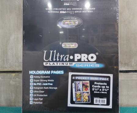 Ultra PRO Platinum Hologram Pages in four-pocket mini-album style. Archival quality pages that holds standard-sized cards with 2-1/2" X 3-1/2" dimensions or smaller. Also ideal for sticker cards, coupons and other collectibles. Pages are clear on both sides and fit in mini two-ring albums.
