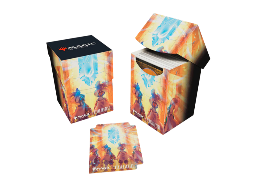 The Magic The Gathering FINAL FANTASY 100+ Deck Box card storage container features vibrant, full-color artwork and includes one deck divider. Made with archival-safe, non-PVC, rigid polypropylene materials, you can store up to 100 double-sleeved cards with confidence. The self-locking lid keeps your cards securely stored when not in use, while also offering easy access. Sized for standard-size trading cards.