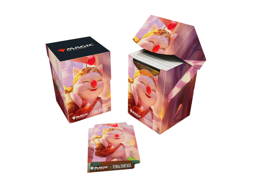 The Magic The Gathering FINAL FANTASY 100+ Deck Box card storage container features vibrant, full-color artwork and includes one deck divider. Made with archival-safe, non-PVC, rigid polypropylene materials, you can store up to 100 double-sleeved cards with confidence. The self-locking lid keeps your cards securely stored when not in use, while also offering easy access. Sized for standard-size trading cards.