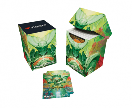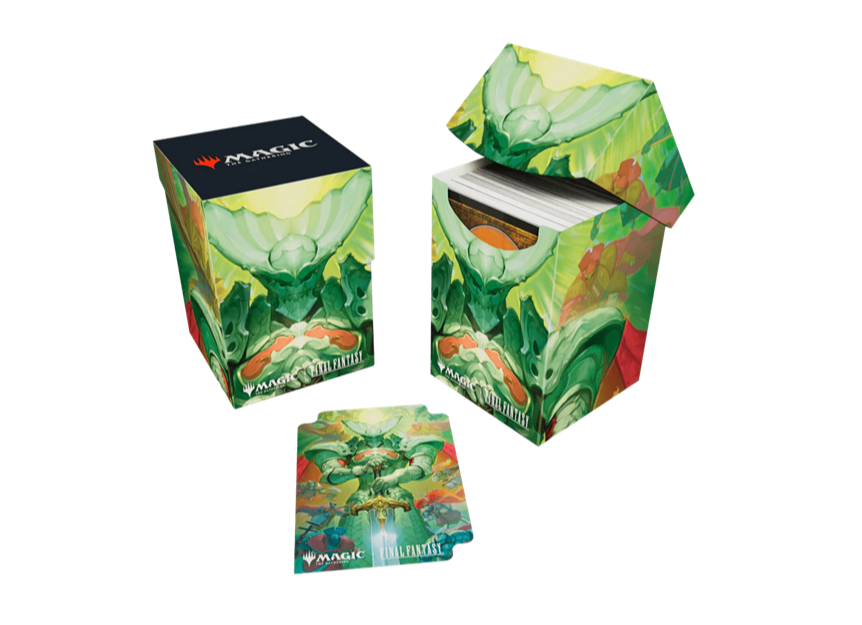 The Magic The Gathering FINAL FANTASY 100+ Deck Box card storage container features vibrant, full-color artwork and includes one deck divider. Made with archival-safe, non-PVC, rigid polypropylene materials, you can store up to 100 double-sleeved cards with confidence. The self-locking lid keeps your cards securely stored when not in use, while also offering easy access. Sized for standard-size trading cards.