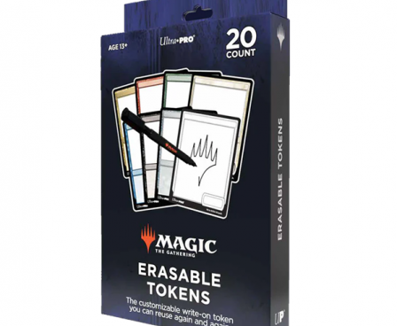 Go wide with Erasable Tokens for Magic: The Gathering, the customizable write-on token you can reuse again and again! This set of 20 dry-erase tokens includes 14 full-color tokens (White, Blue, Black, Red, Green, Artifact, and Multicolor) as well as 6 colorless tokens for a full range of customization. Each one features a Magic: The Gathering card frame around the front edges. Erasable Tokens are made with a wet/dry finish, so you can write and draw right on the surface to create your own custom gameplay tokens! Use the provided space to draw your own creature, and then customize the text by adding a name, power, toughness, and other text details you want to add. Leave your markings on your tokens permanently, or wipe the board clean each time you play and create something totally new! Tokens are sized to fit in Standard 66mm x 91mm Deck Protector Sleeves, so you can easily protect and store them alongside your favorite decks. Package includes one black ink fine point dry erase pen with eraser.